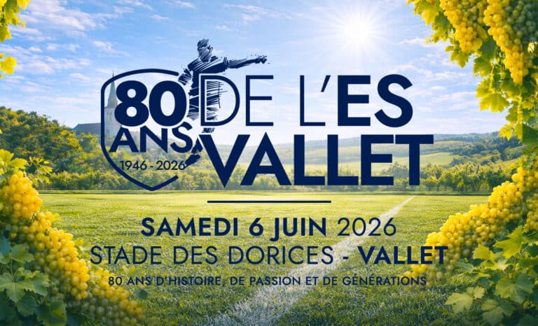 Depuis 1946, des générations, des souvenirs, des valeurs… Le samedi 6 juin 2026, rendez-vous au stade des Dorices à Vallet pour célébrer ensemble 80 ans d’histoire du club La journée est gratuite et ouverte à tous : football, animations, moments de partage… À cette occasion, le FC Entente du Vignoble, l’Etoile Mouzillon et l’ARCT sont invités à célébrer nos 80 ans pour un match de gala entre une sélection de l’ESV et une sélection du vignoble Le soir, place à la soirée des 80 ans (sur inscription) : 1 apéritif offert Rougail saucisses & dessert Soirée dansante Places limitées Inscriptions à la soirée en cliquant ici. Infos : Journée : Alex Tessier – 06 22 46 97 18 Soirée : Bénédicte Aubron – 06 40 43 84 81 On compte sur vous pour faire de cette journée un moment inoubliable